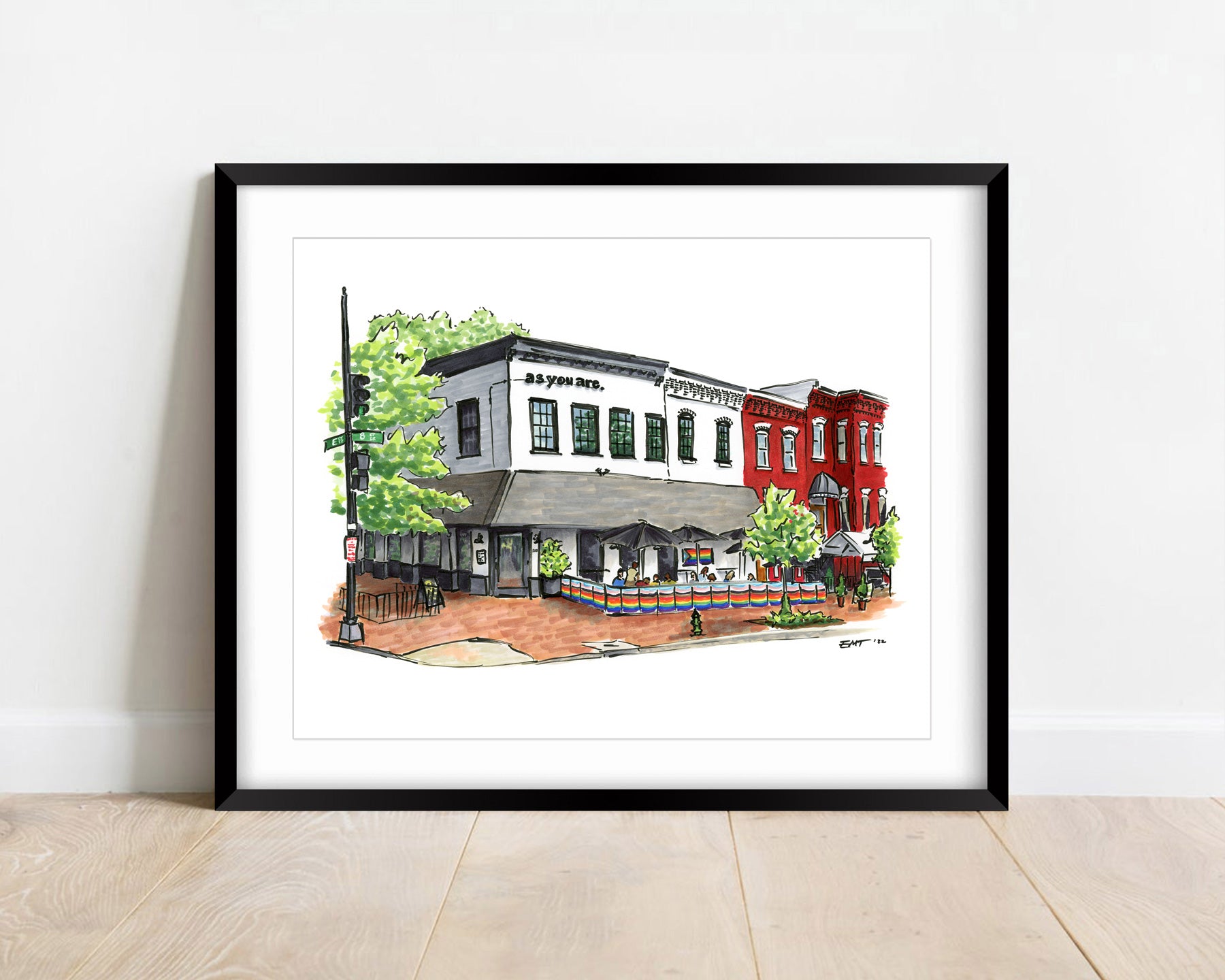 Artwork of As You Are. bar/cafe in the Capitol Hill neighborhood of Washington, DC, done by Capitol Hill artist, Erin Malick Thompson. Print is an 8x10" archival-quality Giclee fine art print on white Deep Matte paper. Frame shown here for DISPLAY PURPOSES ONLY; you will receive an UNMATTED/UNFRAMED print unless you the select matting option.