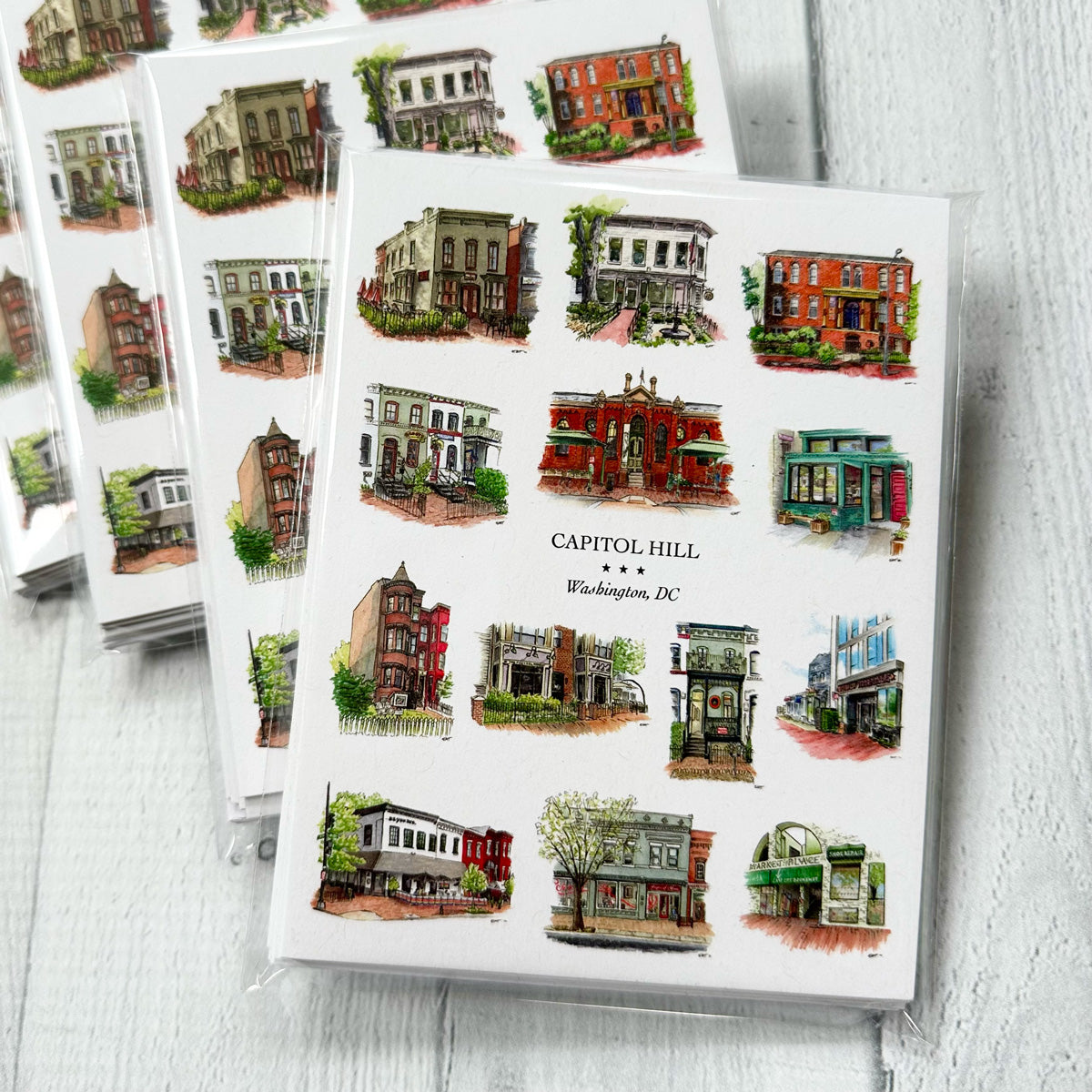 Cards feature reproductions of artwork, originally done by hand in pen and Copic ink and/or watercolor by Capitol Hill artist Erin Malick Thompson, of these Capitol Hill spots: