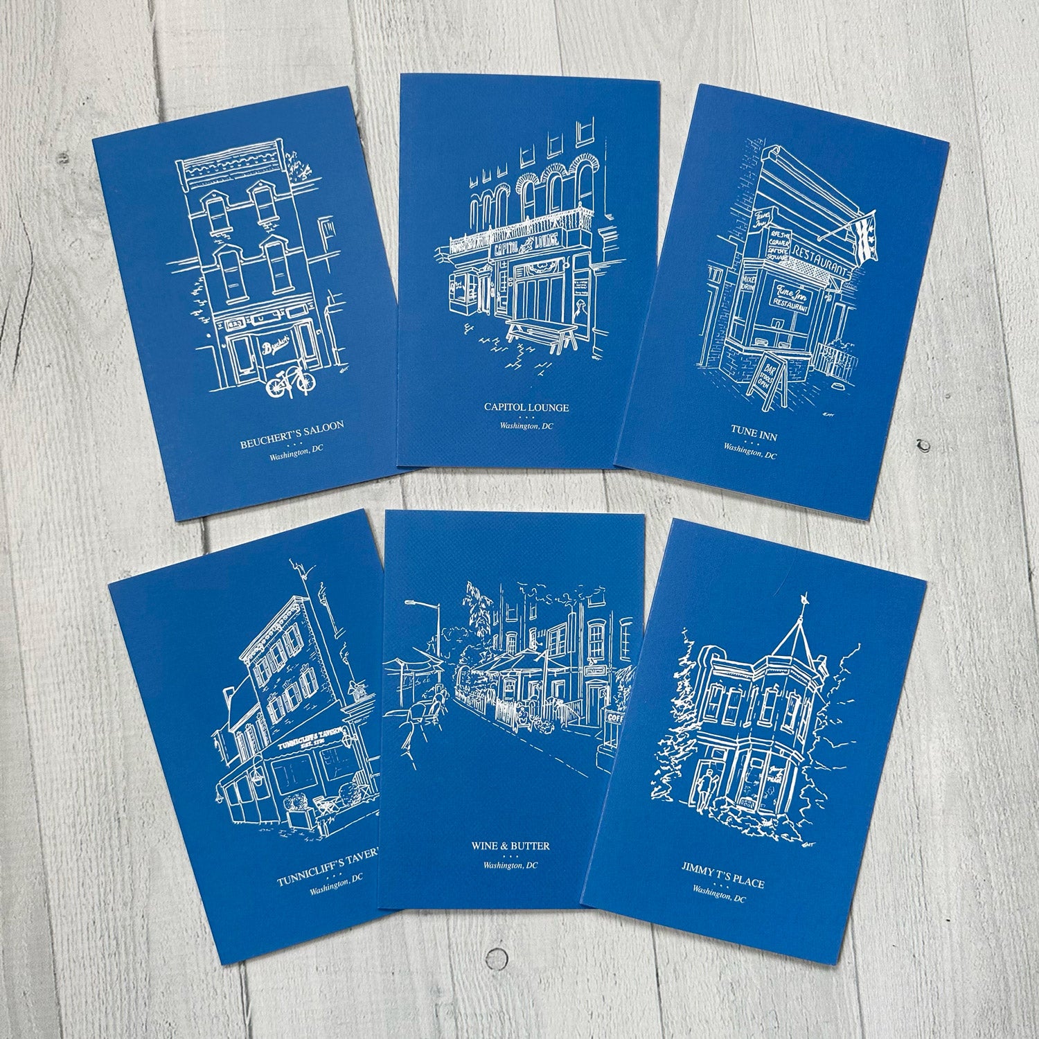 Set contains six 4x6 cards and white envelopes (1 each of Beuchert's Saloon, Capitol Lounge, Tune Inn, Tunnicliff's Tavern, Wine & Butter, and Jimmy T's Place). Blank inside. Cards were printed on 110lb 100% recycled paper and feature artwork that was originally drawn by hand and then digitized for print by Capitol Hill artist, Erin Malick Thompson.