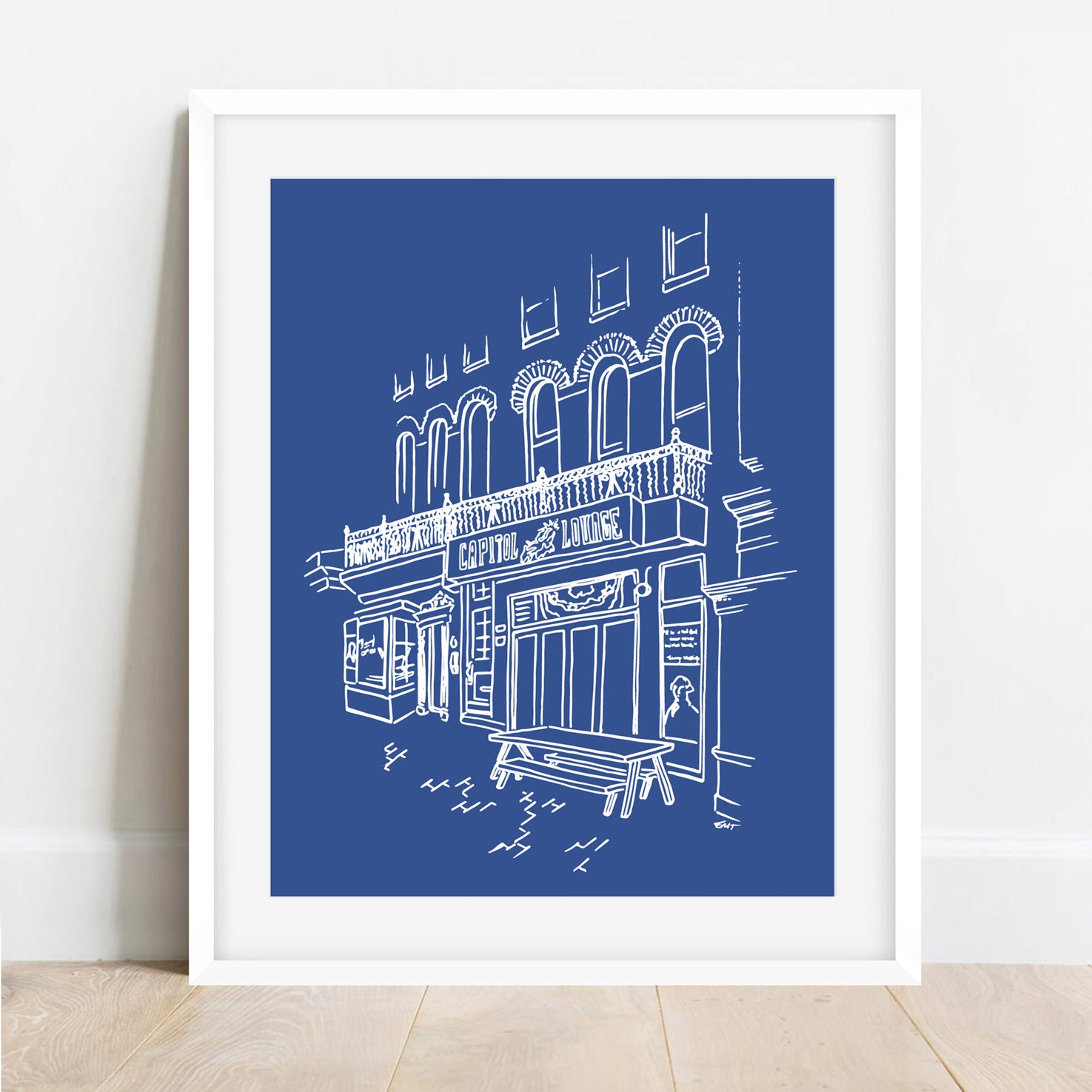 Artwork commemorating the well-loved Capitol Lounge dive bar on Capitol Hill in Washington, DC. Open for 26 years and popular with locals, sports fans, and Hill staffers (both republicans and democrats), the bar announced its closing in September 2020. The original art from which the print was made was done with pen and then digitized and colorized for printing on a blue background, all by Capitol Hill artist, Erin Malick Thompson. Print is an 8x10 archival-quality fine art print available on white matte paper. Frame shown here for DISPLAY PURPOSES ONLY; you will receive an UNMATTED/UNFRAMED print unless you specifically select matting/framing options (and the actual mat/frame differs from the one displayed in this photo).