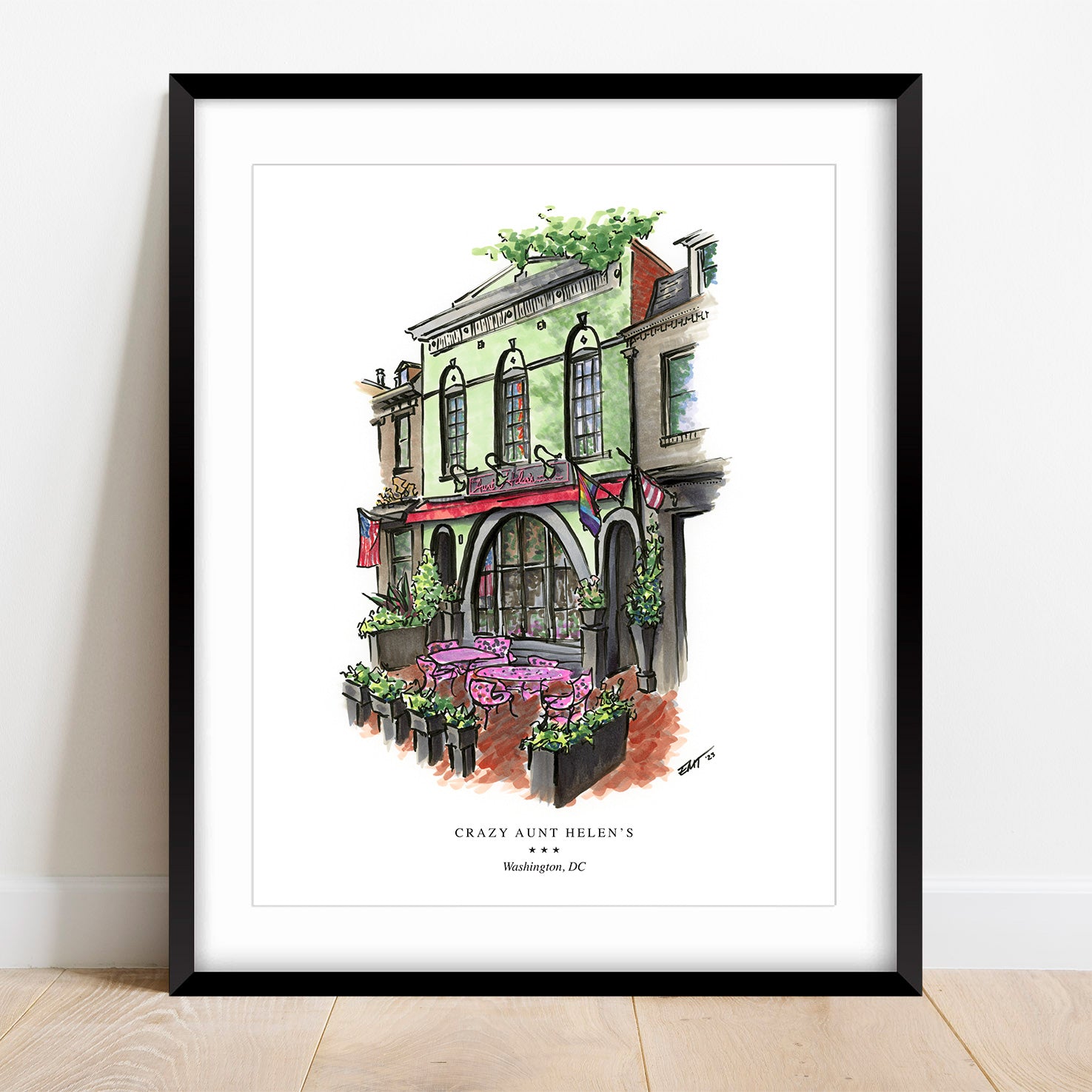 Drawing of Crazy Aunt Helen's restaurant in the Capitol Hill neighborhood of Washington, DC, done by Capitol Hill artist, Erin Malick Thompson. The original art, from which the print was made, was done with pen and Copic ink. Caption reads "Crazy Aunt Helen's / Washington, DC". Print is an archival-quality Giclee fine art print on white matte paper. Frame shown here for DISPLAY PURPOSES ONLY; you will receive an UNMATTED/UNFRAMED print unless you specifically select a framing option (and the mat/frame are different than the one pictured).