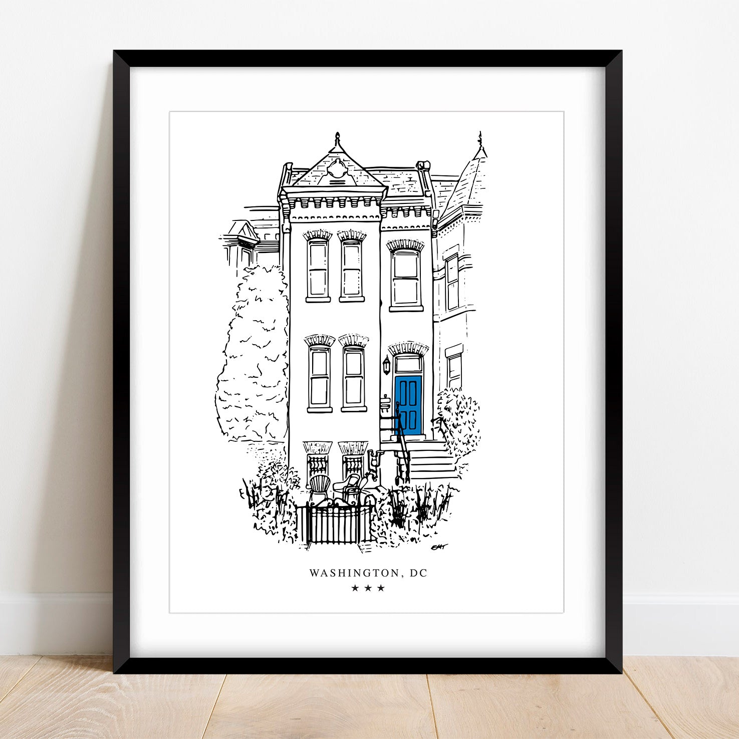 Artwork of a Washington, DC row home with a bright blue door. The art from which the print was made was originally drawn by hand with pen by Capitol Hill artist, Erin Malick Thompson, and then digitized and colorized for print. Caption reads "Washington, DC". Archival-quality 8x10 print is available on white matte paper. Frame shown here for DISPLAY PURPOSES ONLY; you will receive an UNMATTED/UNFRAMED print.