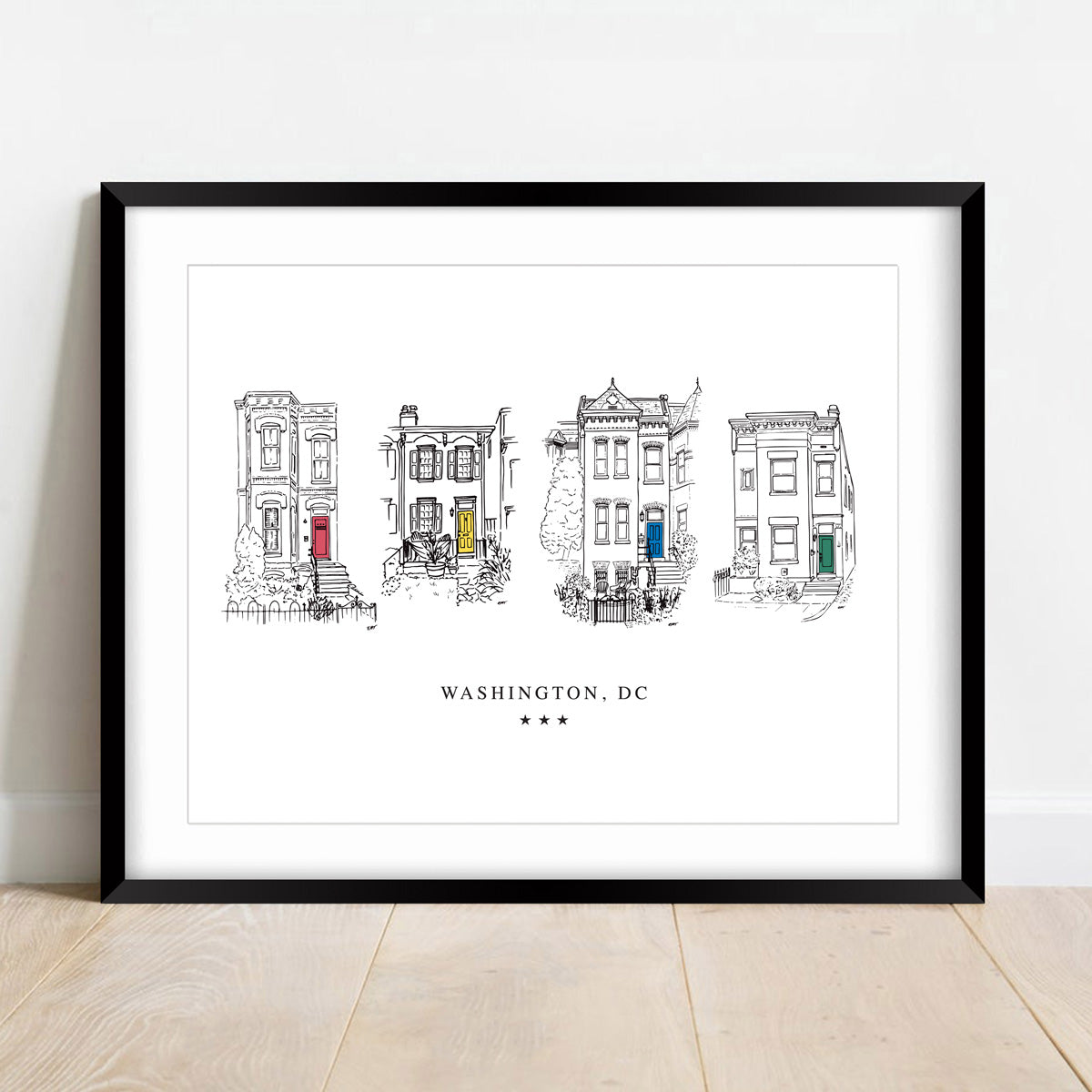 Artwork of Washington, DC row homes with bright colored doors. The art from which the print was made was originally drawn by hand with pen by Capitol Hill artist, Erin Malick Thompson, and then digitized and colorized for print. Caption reads "Washington, DC". Archival-quality 8x10 print is available on white matte paper with a horizontal/landscape or vertical/portrait design. Frame shown here for DISPLAY PURPOSES ONLY; you will receive an UNMATTED/UNFRAMED print.