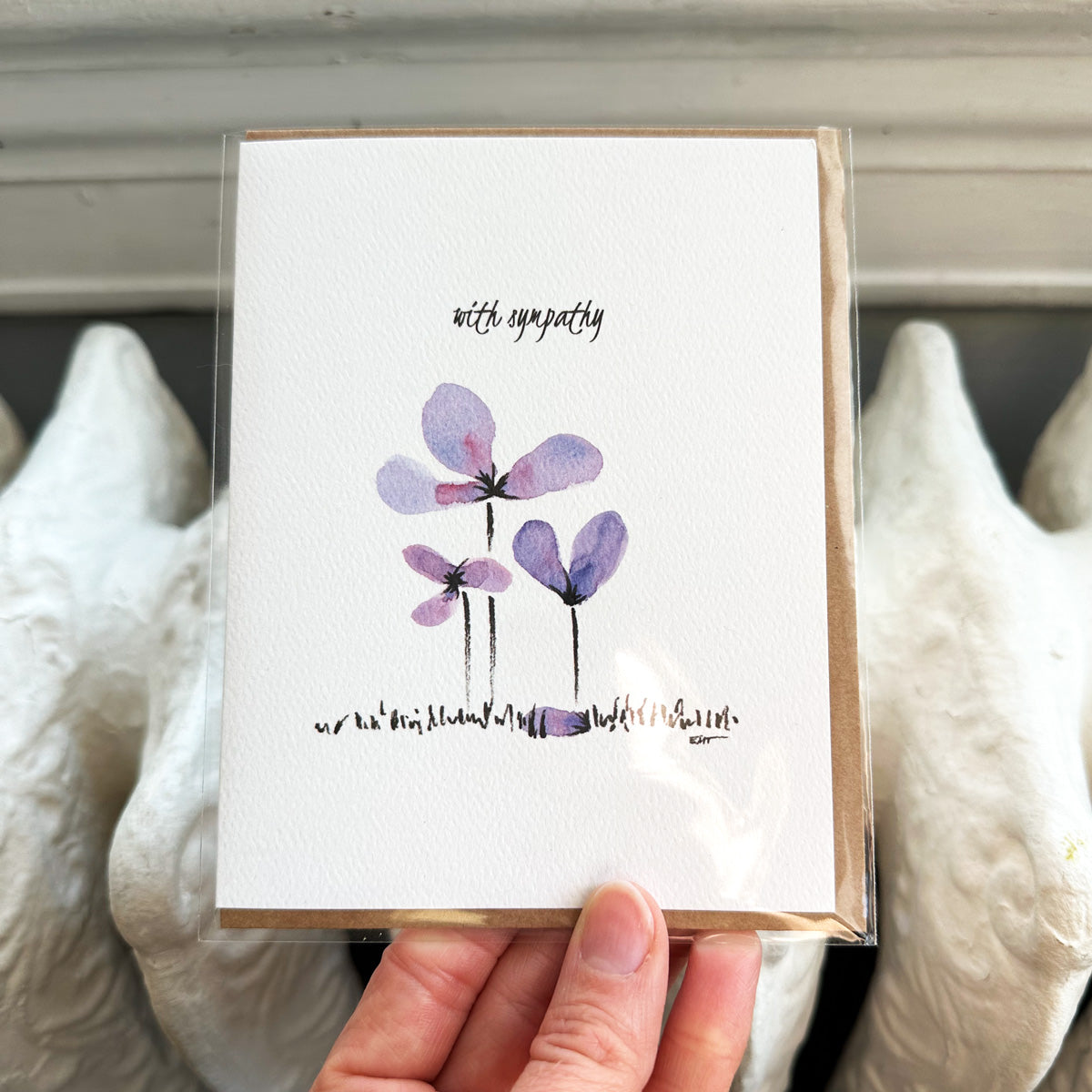 Card featuring an illustration of three flowers growing, but one has lost a petal. Message on the front reads "with sympathy" (blank inside).