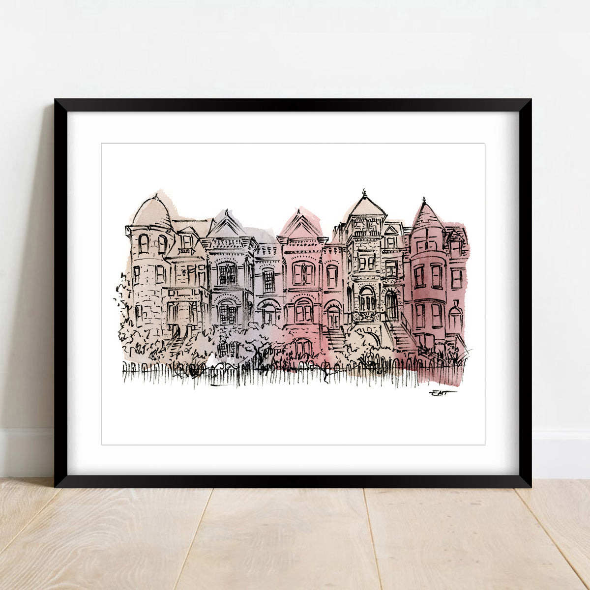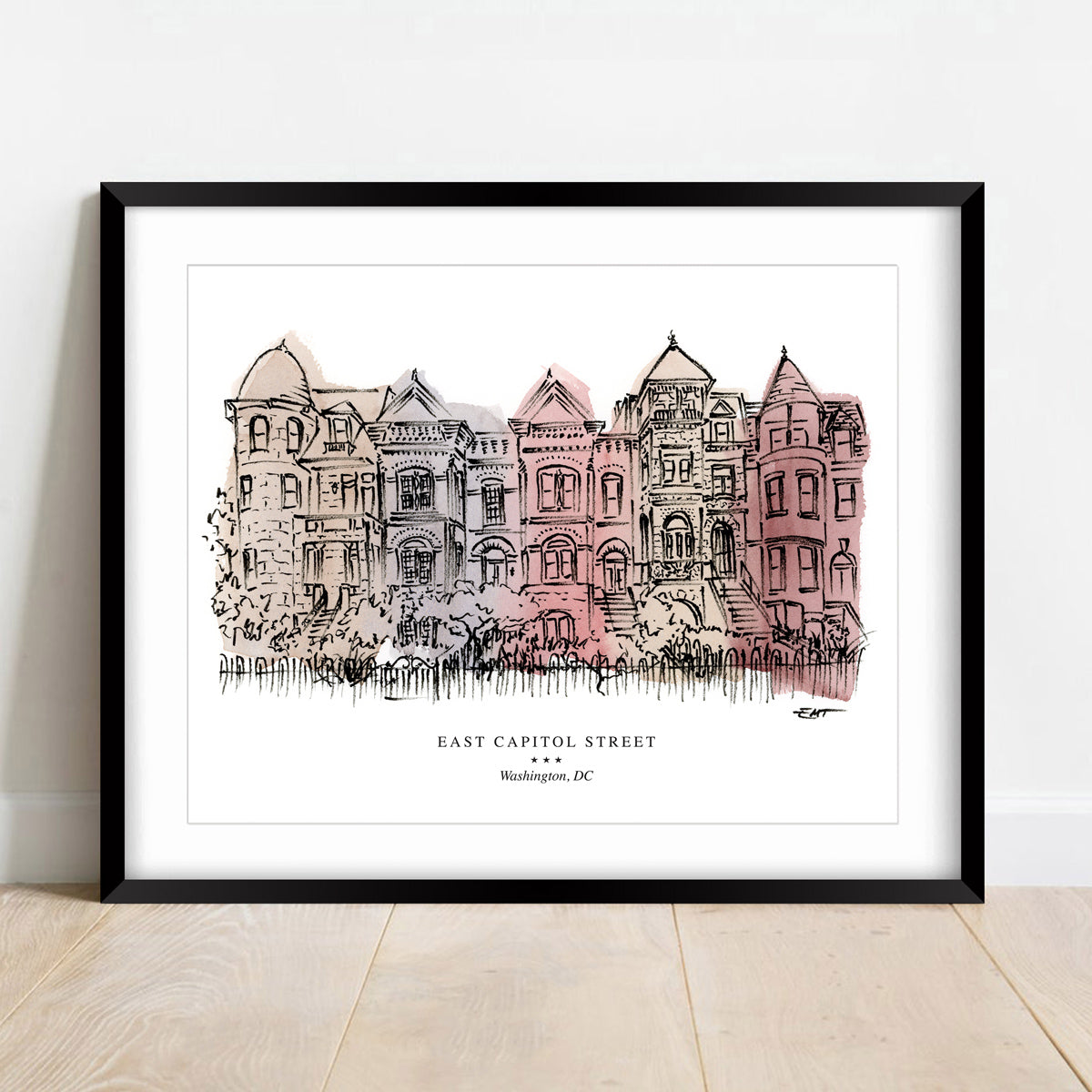 Print of an ink and watercolor sketch of Washington, DC row houses, inspired by a stretch of homes along East Capitol Street (Northeast), done by Capitol Hill artist, Erin Malick Thompson. Unlike many of her watercolor works, for this piece, the artist applied the wash of watercolor first, approximating the shape of the row of homes, before doing a pen sketch of the homes on top. Available with and without the "East Capitol Street" caption.
