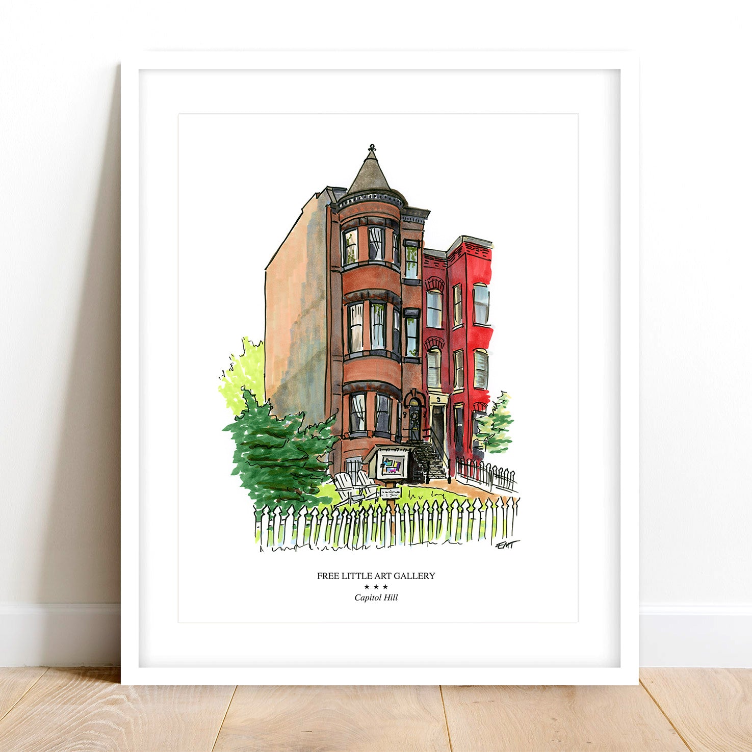 Fine art print of a home and its Free Little Art Gallery — a place to take or leave a piece of artwork for passersby to enjoy — on East Capitol Street in the Capitol Hill neighborhood of Washington, DC. The original artwork, from which the print was made, was created by Capitol Hill artist, Erin Malick Thompson, using pen and Copic ink. Caption at the bottom of the print reads "FREE LITTLE ART GALLERY", followed by 3 stars, followed by "Capitol Hill". Print is an 8x10 archival-quality Giclee fine art print on white Deep Matte paper. Frame shown here for DISPLAY PURPOSES ONLY; you will receive an UNMATTED/UNFRAMED print.
