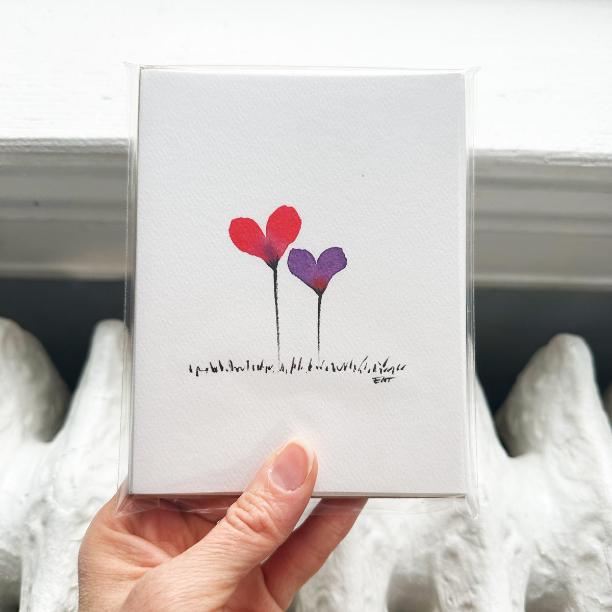 Two hearts growing together -- one red with purple accent, the other purple with red accent.