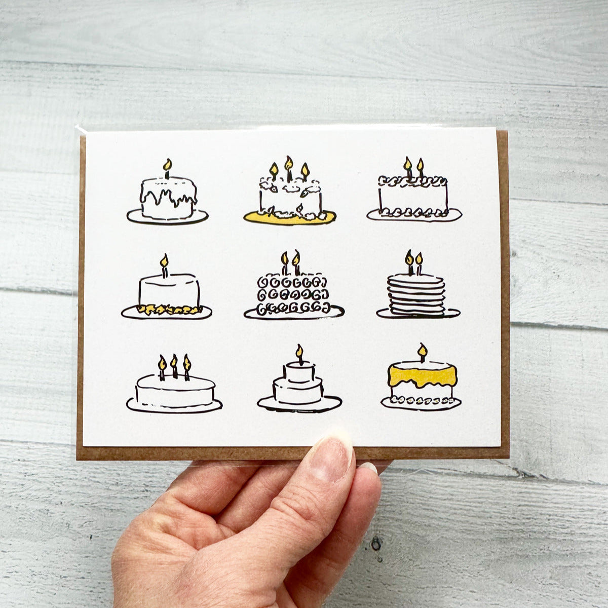 Single A2 card with kraft envelope. Blank inside. Printed on 120lb 100% recycled paper and packaged in a compostable sleeve. Cards feature artwork of cakes with candles, originally drawn by hand by Erin Malick Thompson and digitally edited for print.