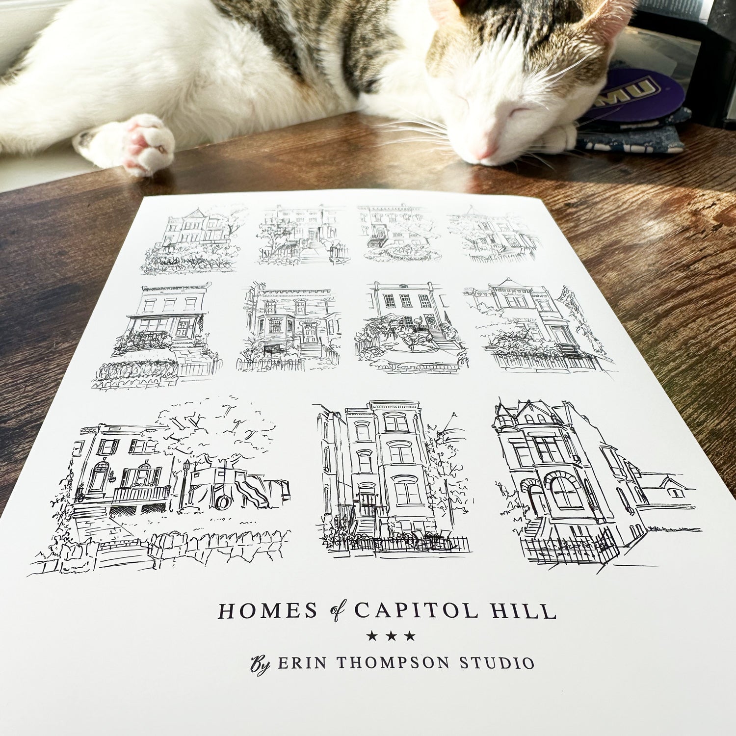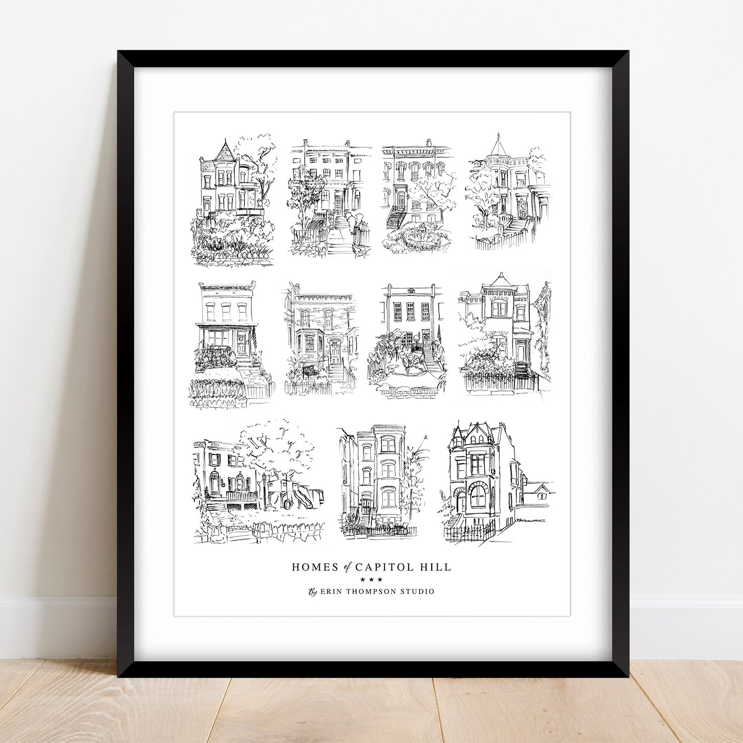 Collection of black and white sketches of homes in the Capitol Hill neighborhood of Washington, DC, done by Capitol Hill artist, Erin Malick Thompson. Print is an 8x10" archival-quality Giclee fine art print on white Deep Matte paper. Frame shown here for DISPLAY PURPOSES ONLY; you will receive an UNMATTED/UNFRAMED print unless you specifically select a matting/framing option (and the actual mat/frame differs from the one displayed in this photo).