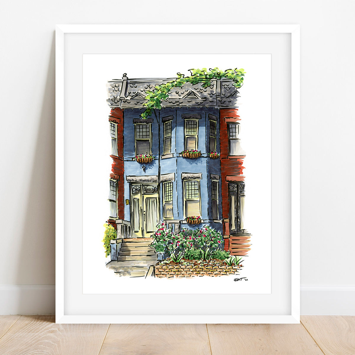A drawing of a picturesque blue row house in the Capitol Hill neighborhood of Washington, DC, drawn "en plein air" (on location, from the sidewalk across the street) by Capitol Hill artist, Erin Malick Thompson. The original art from which the print was made was done with pen and Copic ink. Print is an 8x10 archival-quality Giclee fine art print on white Deep Matte paper. Frame shown here for DISPLAY PURPOSES ONLY; you will receive an UNMATTED/UNFRAMED print unless you specifically select the framing option (and the mat/frame are different than the one pictured).