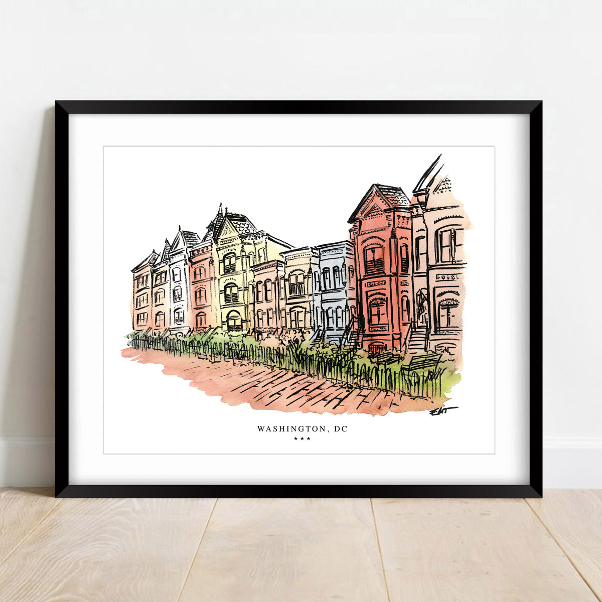 Print of watercolor and acrylic artwork of Washington, DC row houses, inspired by a stretch of homes along East Capitol Street (Northeast), done by Capitol Hill artist, Erin Malick Thompson. Unlike many of her watercolor works, for this piece, the artist applied the wash of watercolor first, approximating the shape of the row of homes, before drawing the homes on top with black acrylic paint pen. Caption reads "Washington, DC".