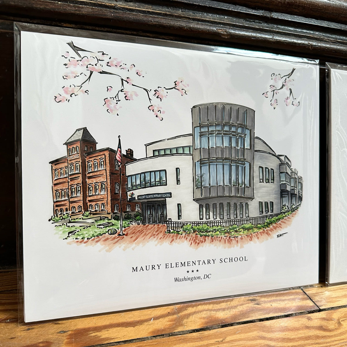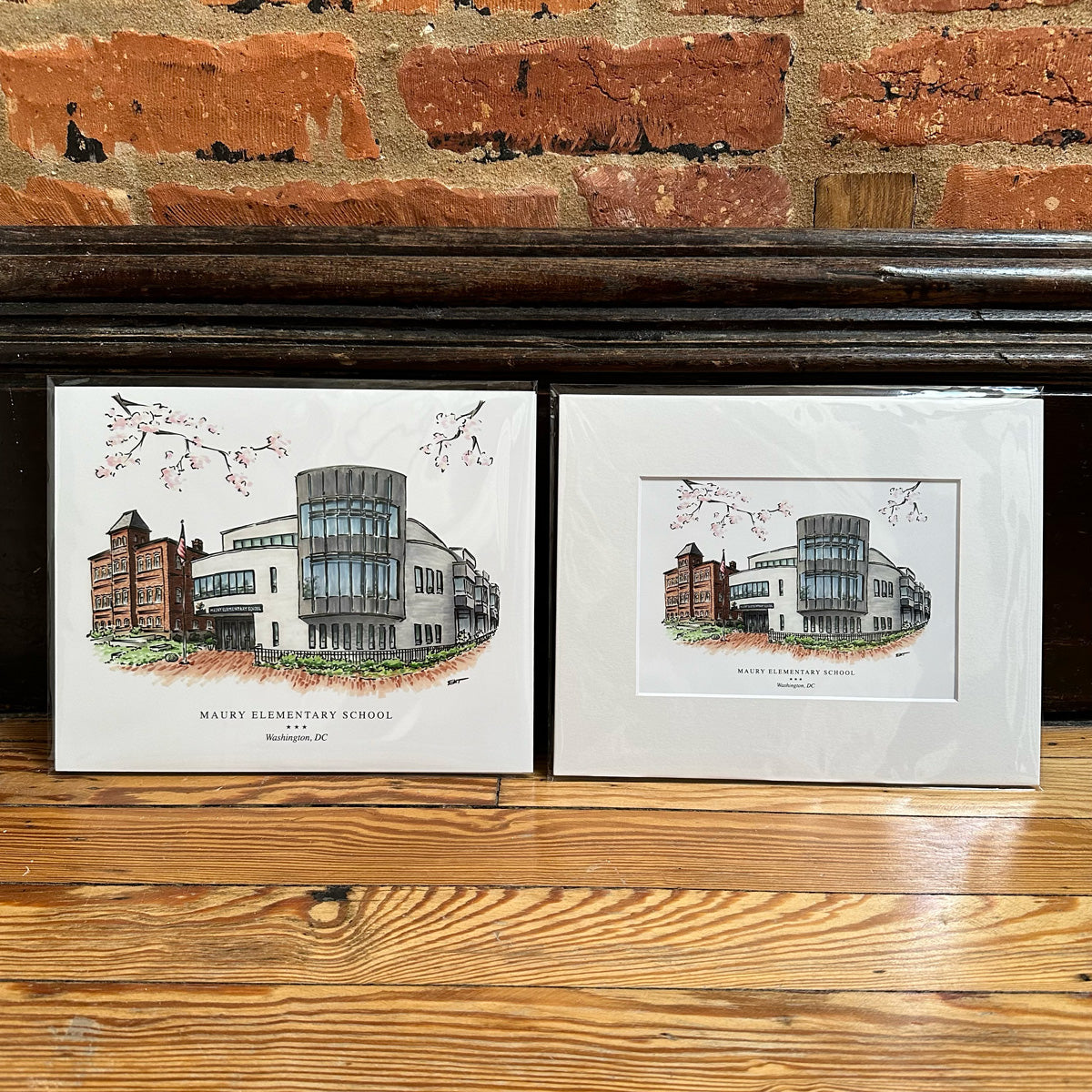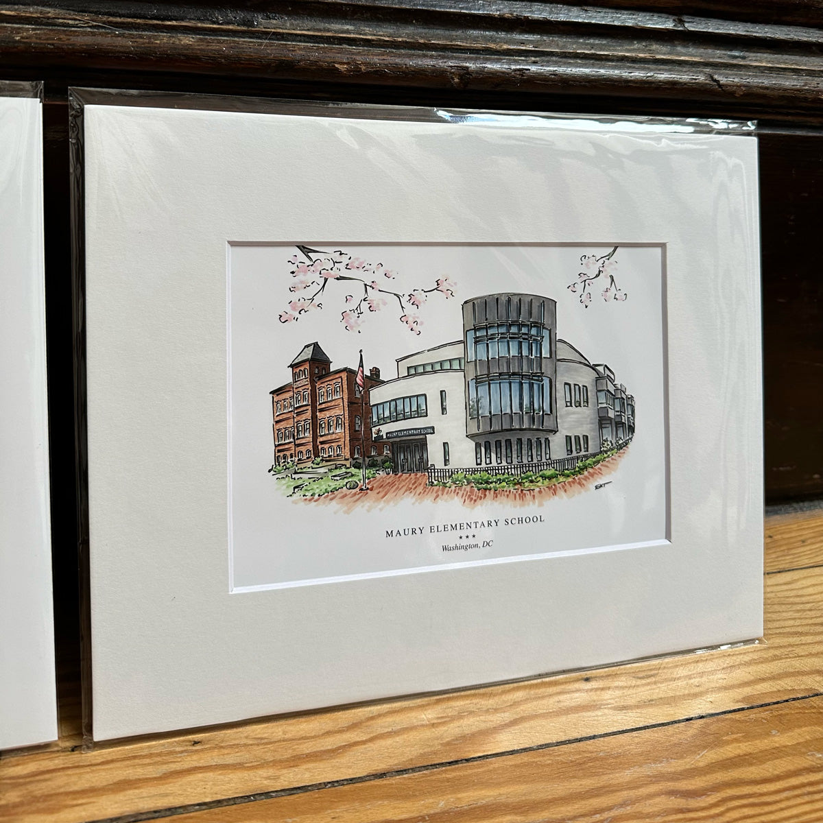The perfect gift for a Maury grad! Artwork captures the beloved neighborhood school, Maury Elementary, originally done in ink by Capitol Hill artist, Erin Malick Thompson, whose children attend the school. Print is an archival-quality Giclee fine art print on white Deep Matte paper. The artwork is sized such that the branches of blossoms will be overlapped by a standard mat cut for the size print ordered (for example, a 7.5x9.5 opening for 8x10 art).