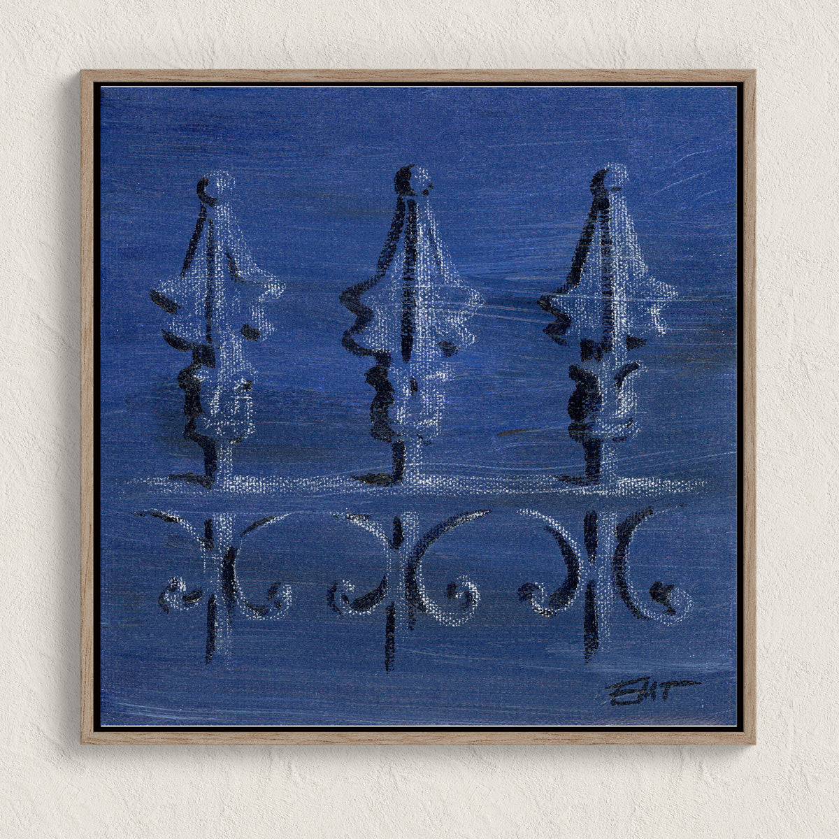 Originals measure roughly 8x8x1.5" with the edges fully painted, and the works are coated with a professional varnish for protection. Prints (8x8 or 12x12) are roughly 7/8" deep, and the artist applied professional varnish over the printed canvas to enhance the authentic look, while the edges that wrap around the stretcher bars are white canvas.