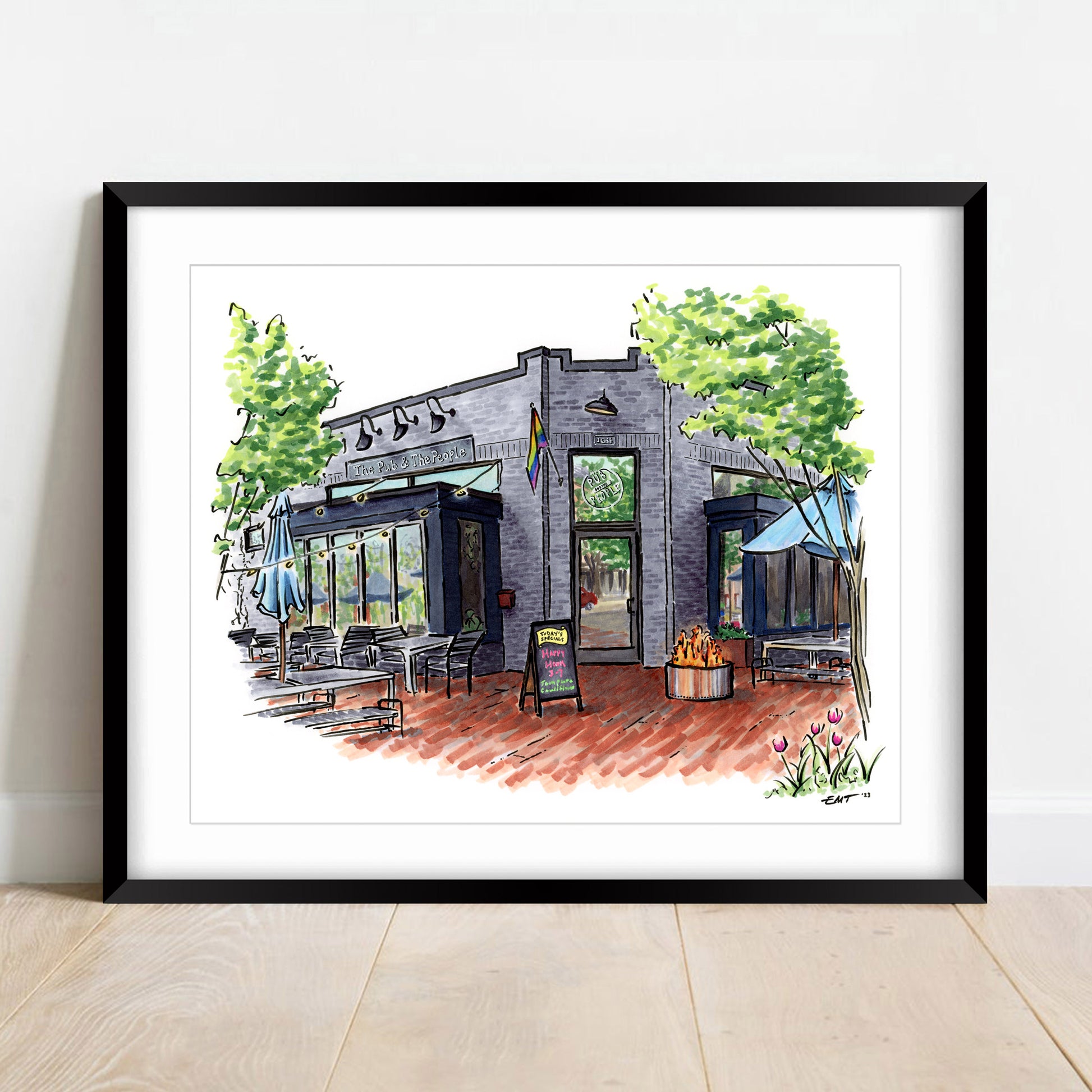 Artwork of Pub & the People, a popular corner bar in the Bloomingdale/Eckington neighborhood of Washington, DC, done by Capitol Hill artist, Erin Malick Thompson. Sandwich board depicted in the print tells of the bar's happy hour and award-winning tempura cauliflower appetizer. Print is an archival-quality Giclee fine art print on white Deep Matte paper. Frame shown here for DISPLAY PURPOSES ONLY; you will receive an UNMATTED/UNFRAMED print unless you select a matting option.