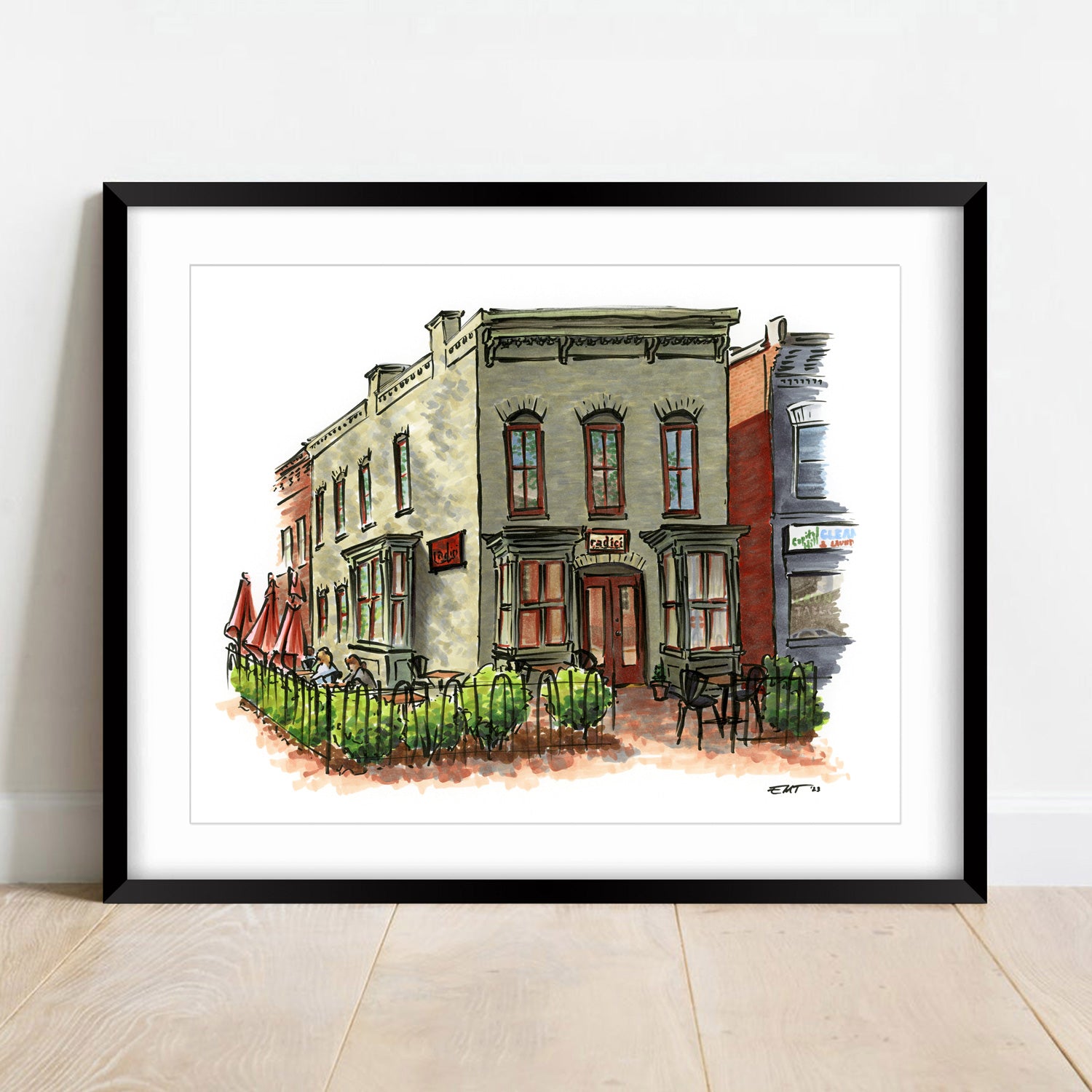 Artwork of the Capitol Hill neighborhood favorite, Radici Market (Washington, DC), done by Capitol Hill artist, Erin Malick Thompson. Print is an 8x10 archival-quality Giclee fine art print on white Deep Matte paper. Frame shown here for DISPLAY PURPOSES ONLY; you will receive an UNMATTED/UNFRAMED print, unless you specifically select a matting/framing option (and the mat/frame will be different than that pictured). Black frame currently offered is made of engineered wood and has real glass.