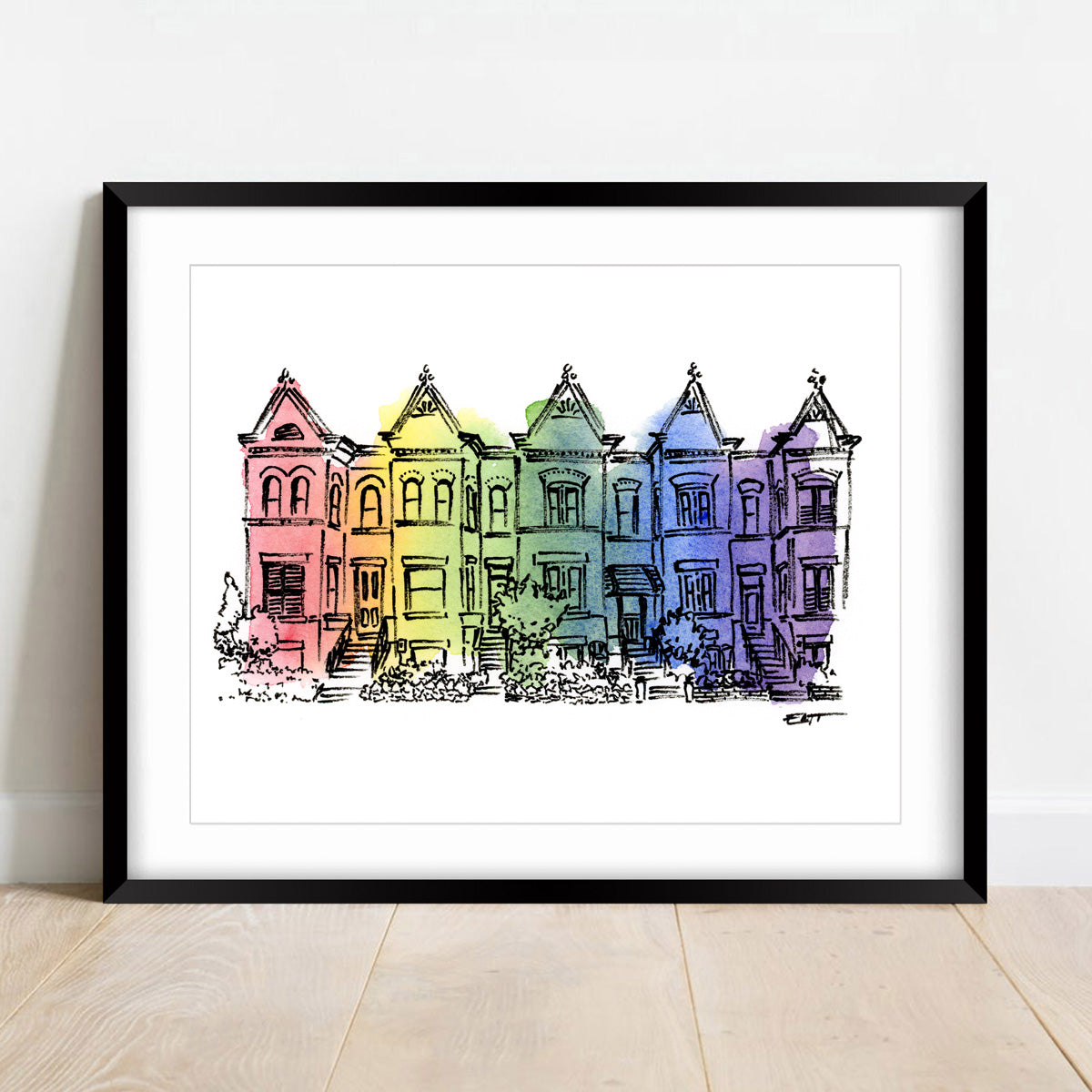 Print of an ink and watercolor sketch of Washington, DC row houses, inspired by a stretch of homes in Northeast DC, done by Capitol Hill artist, Erin Malick Thompson. Unlike many of her watercolor works, for this piece, the artist applied the wash of watercolor first, before doing a pen sketch of the homes on top.