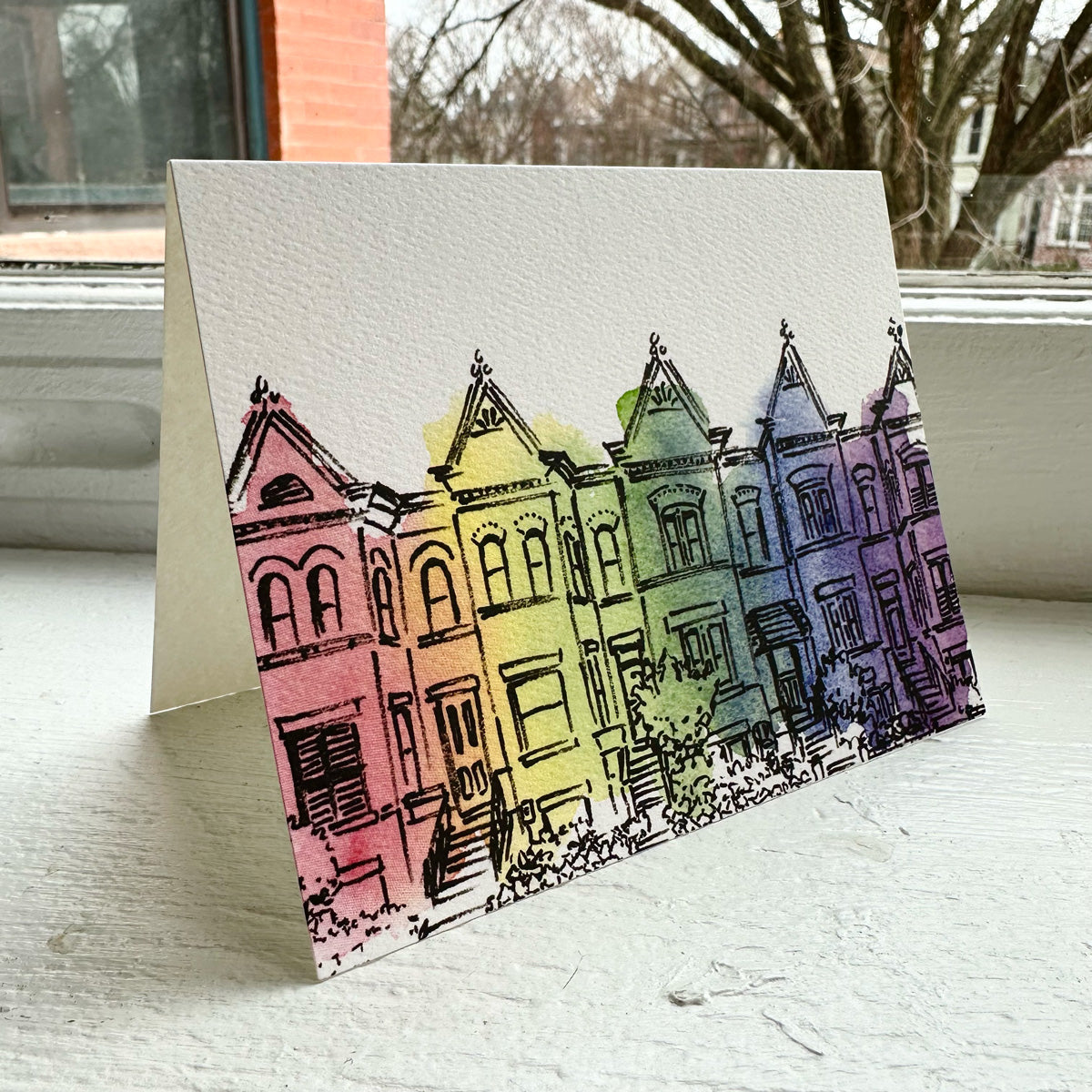 Set of 6 note cards featuring an ink and watercolor sketch of row homes by Washington, DC artist, Erin Malick Thompson. Perfect for thank you notes, welcoming a new neighbor, sending to real estate clients/prospects, brightening a friend's day, celebrating Pride, thanking your new airbnb guests, or just saying hello! The original artwork from which the card is based, was inspired by a stretch of homes in the artist's neighborhood, drawn and painted by hand, and then scanned for printing on the cards.