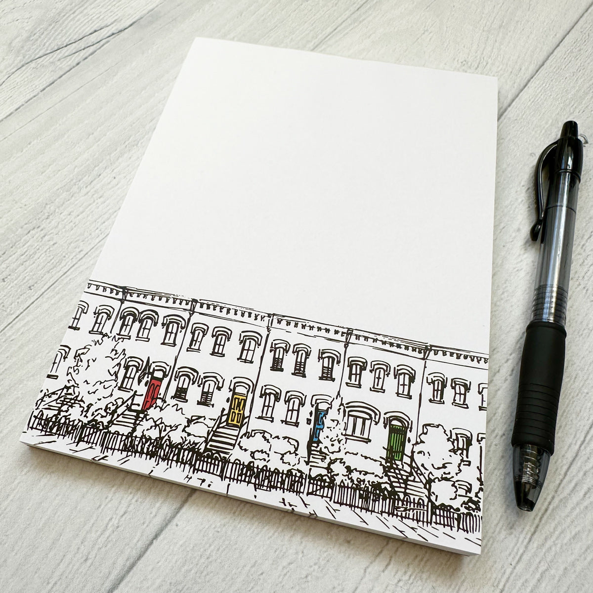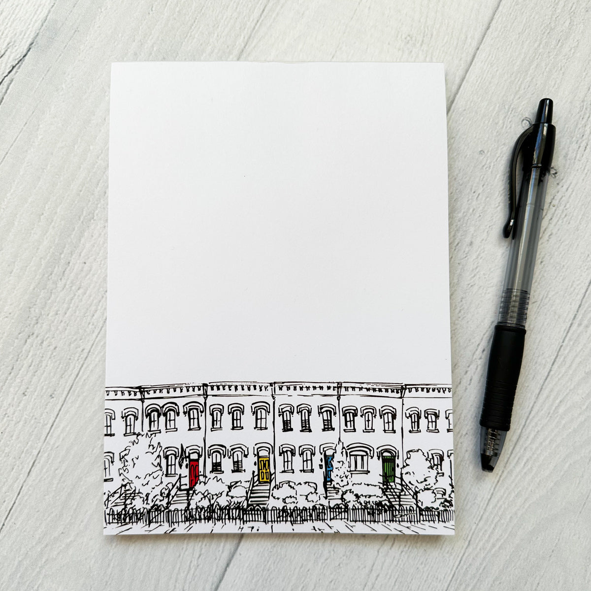 Notepads featuring black and white line artwork of DC row houses with colored doors by Erin Malick Thompson. Each notepad measures 5"x7" and has 50 sheets. Printed on recycled paper with a heavy brown chipboard backing.