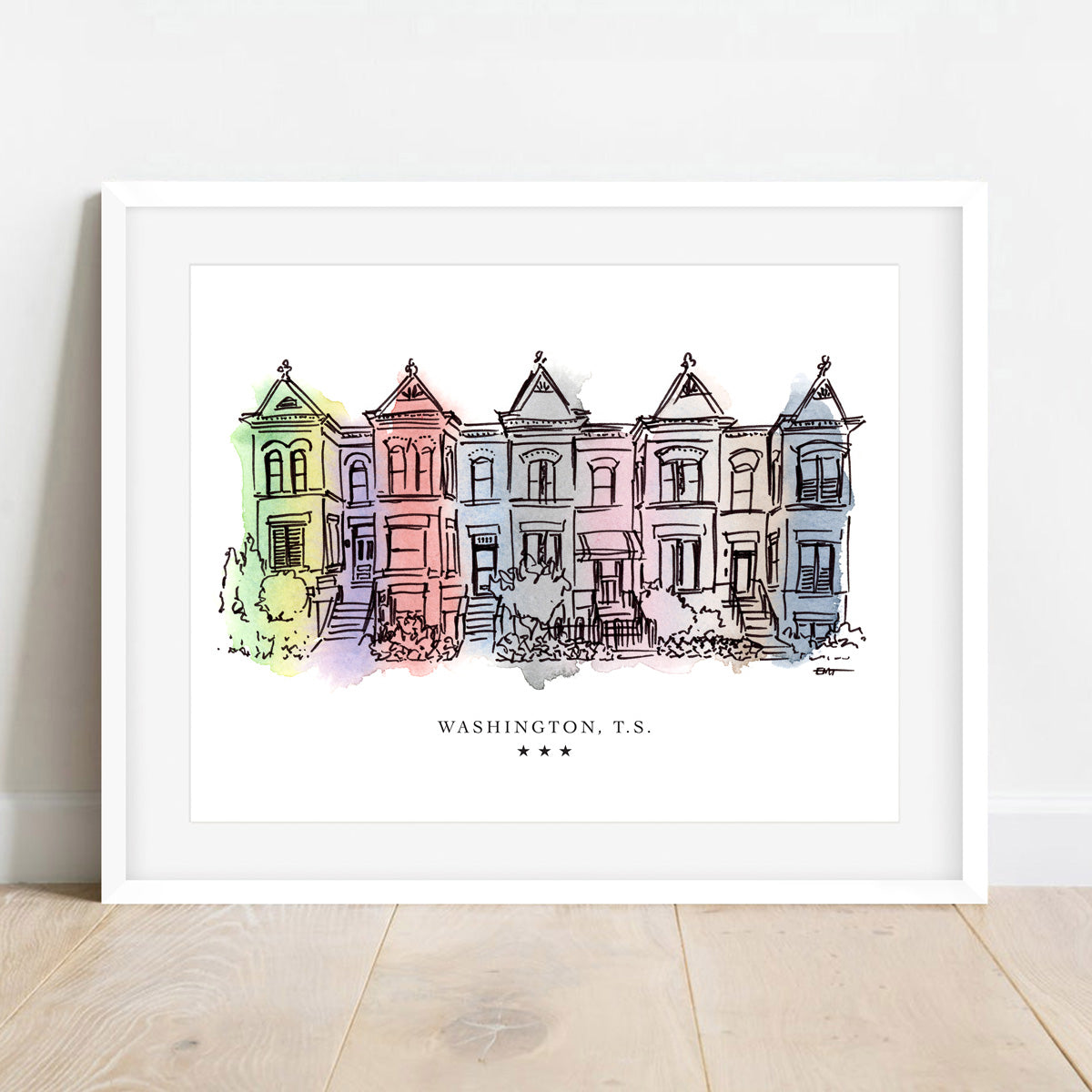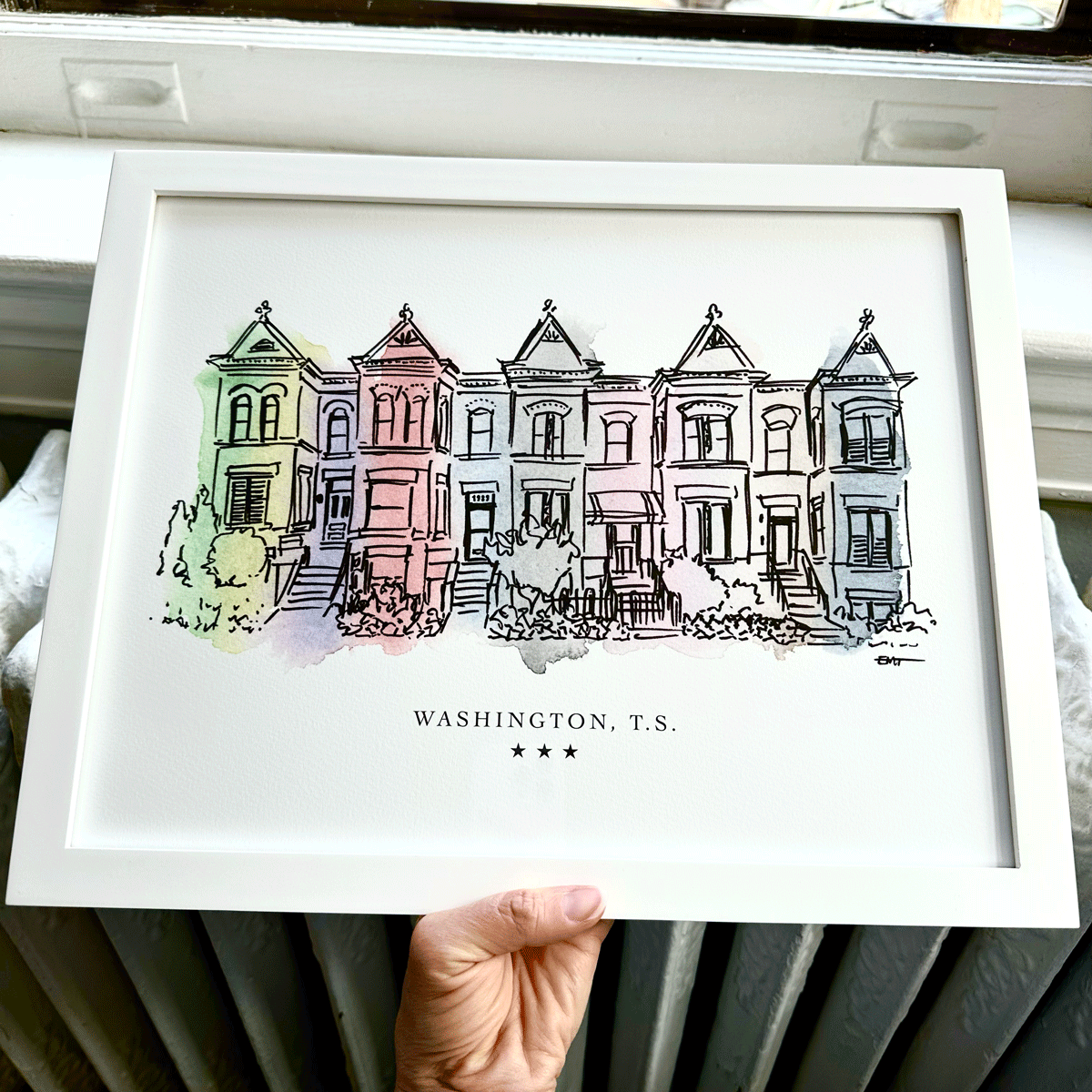 The watercolor background pays tribute to the colors which fans associate with Taylor Swift's albums, one house is numbered 1989 like one album, and the caption reads "Washington, T.S." all to bring meaning to her loyal fans. The drawing is inspired by a row of homes on 13th Street, NE (a perfect way to honor T.S.'s favorite number!)