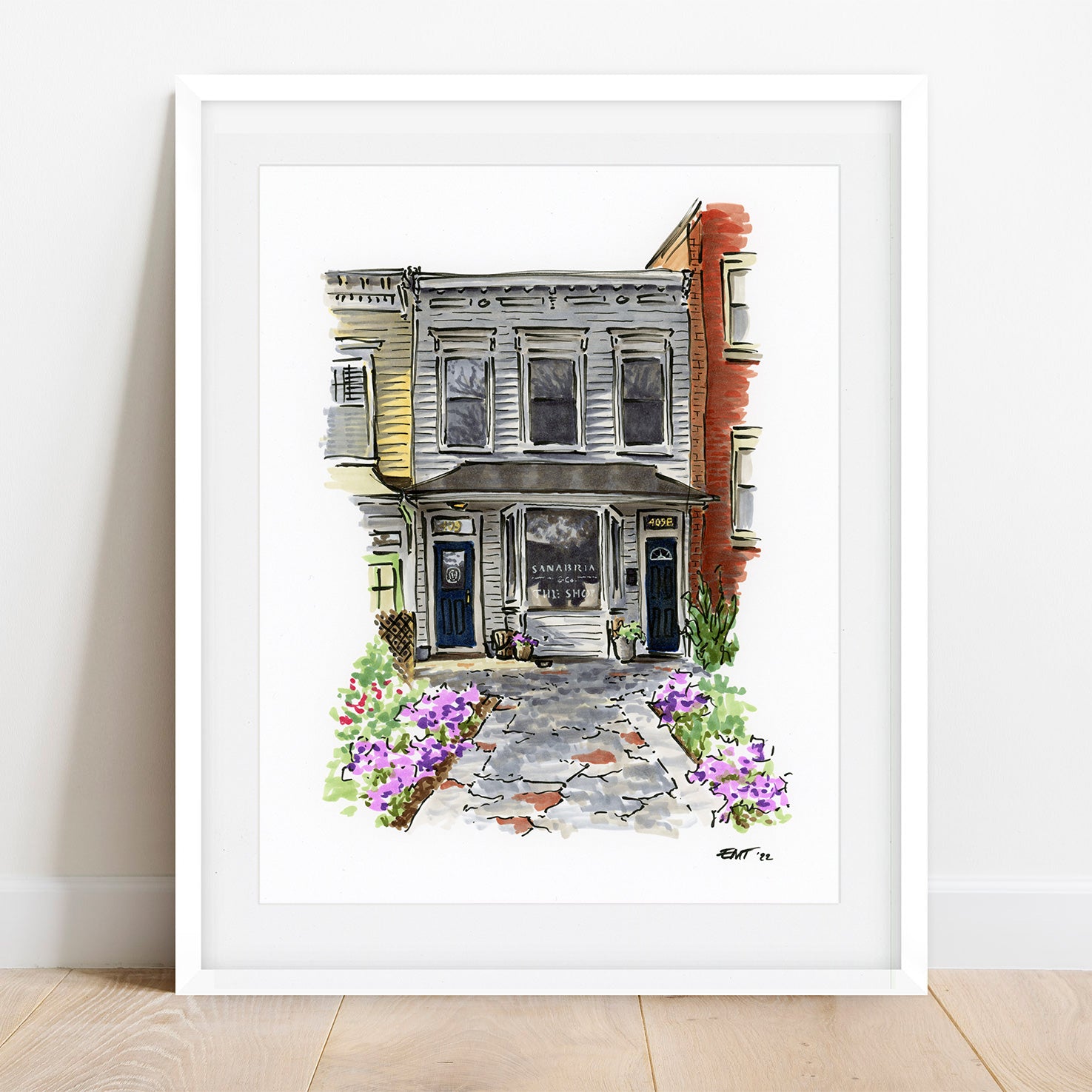 Drawing of a home essentials boutique in the Capitol Hill neighborhood of Washington, DC, done by Capitol Hill artist, Erin Malick Thompson. The original art from which the print was made was done with pen and Copic ink. Print is an 8x10 archival-quality Giclee fine art print on white Deep Matte paper. Frame shown here for DISPLAY PURPOSES ONLY; you will receive an UNFRAMED print.