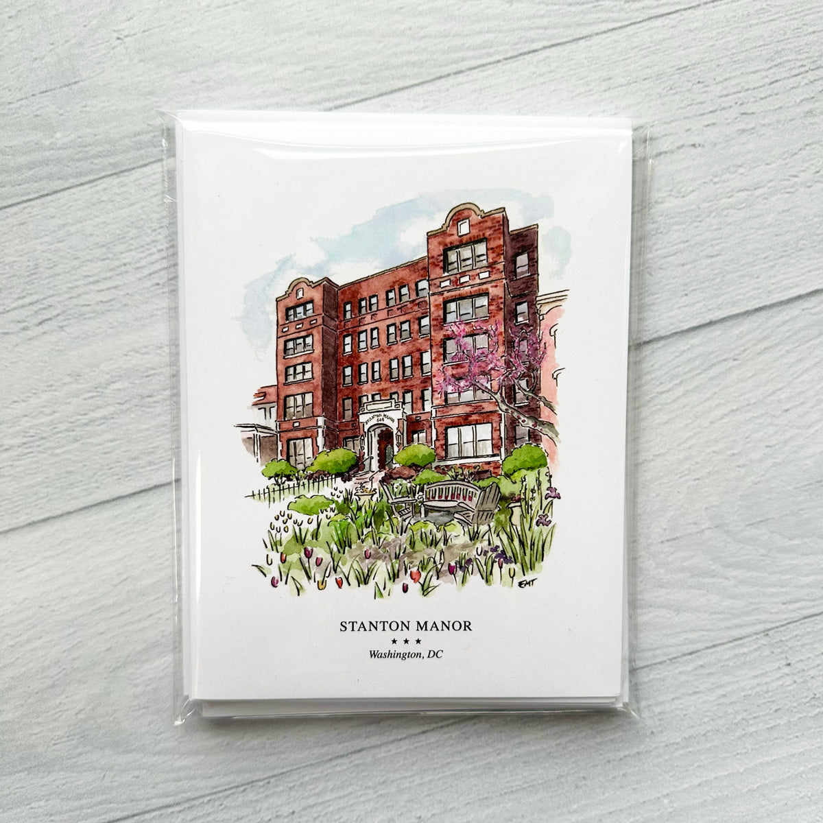 Set contains six A2 cards and white envelopes (all cards have the same design shown with the front message, "STANTON MANOR" / "Washington, DC"). Blank inside. Cards were printed on 110lb 100% recycled paper. Cards feature a reproduction of artwork originally done by hand in pen and watercolor by Capitol Hill artist, Erin Malick Thompson, who used to live in this building!