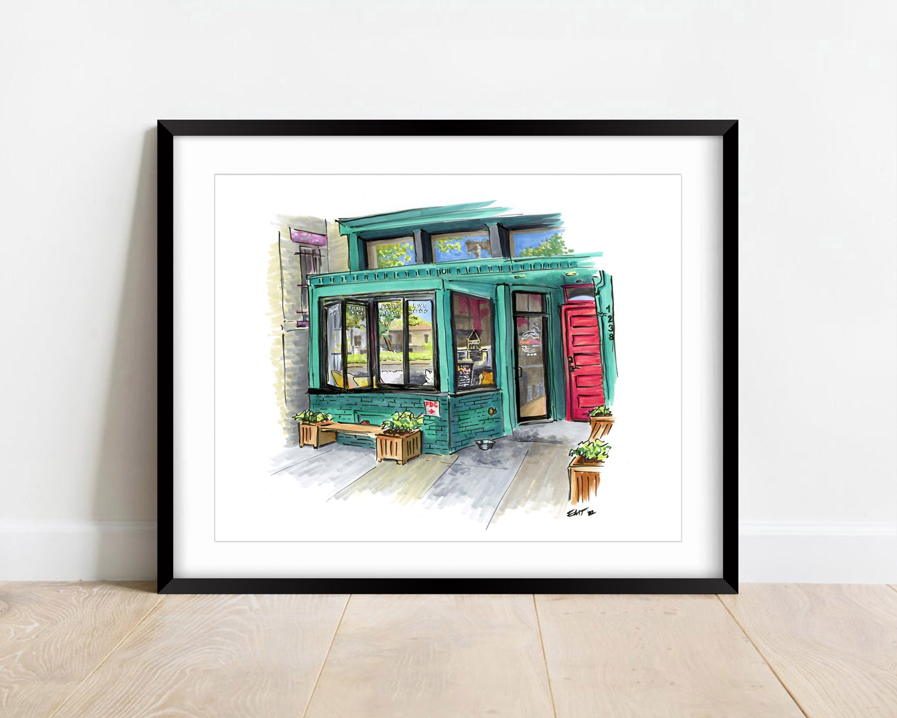 Artwork of Sweet Crimes Bakery in the Capitol Hill neighborhood of Washington, DC, done by Capitol Hill artist, Erin Malick Thompson. Print is an 8x10" archival-quality Giclee fine art print on white Deep Matte paper. Frame shown here for DISPLAY PURPOSES ONLY; you will receive an UNMATTED/UNFRAMED print unless you the select matting option.