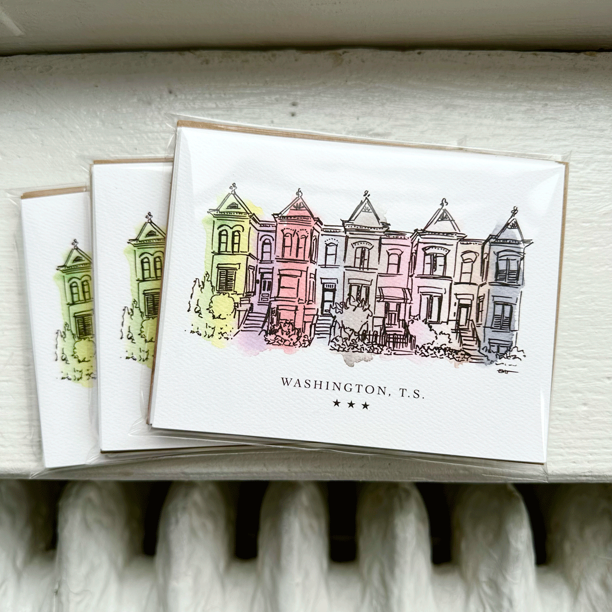 Set of six A2 note cards featuring ink and watercolor artwork of row homes by Washington, DC artist, Erin Malick Thompson (all cards have the same design).