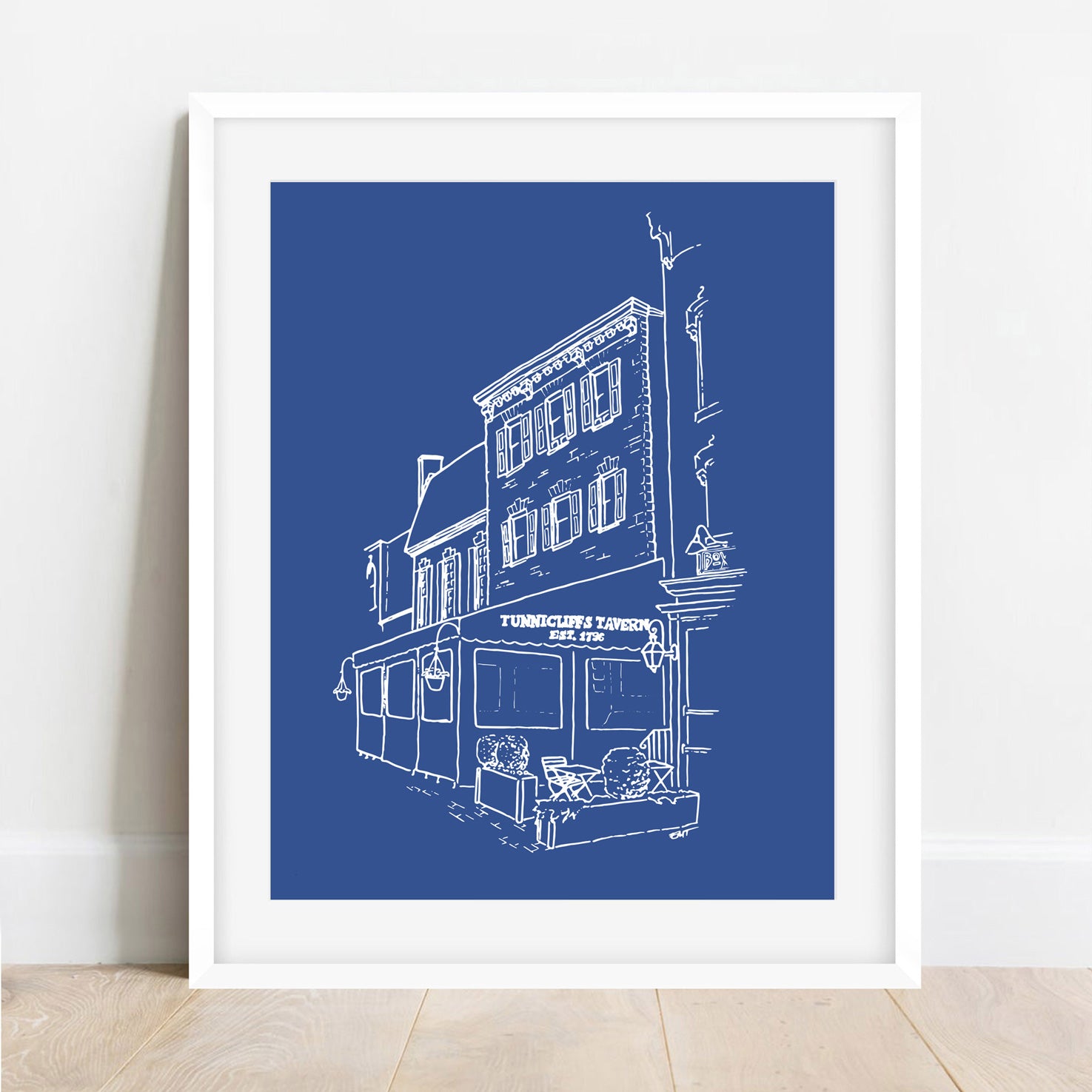 Artwork of neighborhood favorite restaurant and bar, Tunnicliff's Tavern, on Capitol Hill in Washington, DC. The original art from which the print was made was done with pen and then digitized and colorized for printing on a blue background, all by Capitol Hill artist, Erin Malick Thompson. Print is an 8x10 archival-quality fine art print on white matte paper. Frame shown here for DISPLAY PURPOSES ONLY; you will receive an UNMATTED/UNFRAMED print unless you specifically select matting/framing options (and the actual mat/frame differs from the one displayed in this photo).