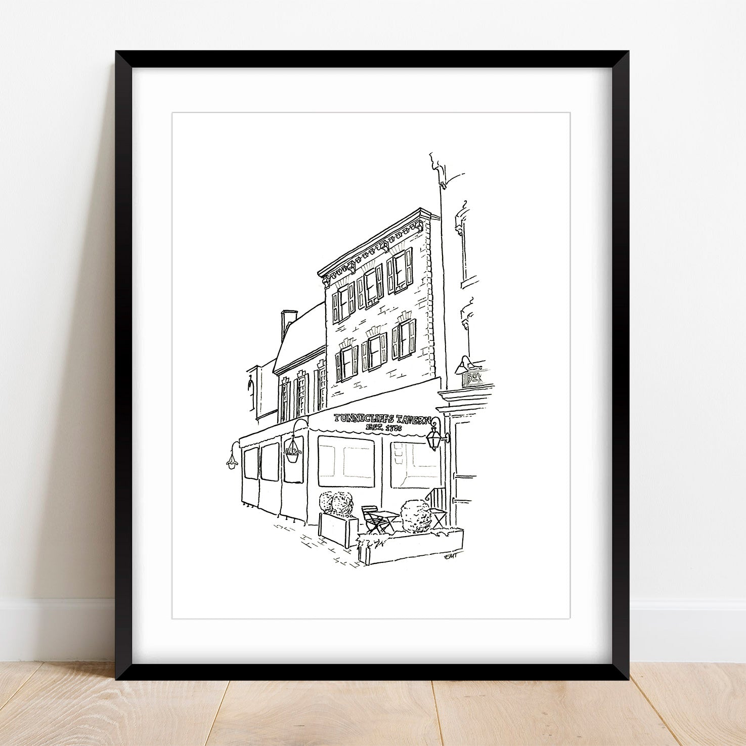 Artwork of Tunnicliff's Tavern, on Capitol Hill in Washington, DC. The original art from which the print was made was done with pen by Capitol Hill artist, Erin Malick Thompson. Print is an archival-quality print available on white matte paper. Can be displayed in a mat opening cut for 8x10" art (outer paper dimensions 10x12"). Frame shown here for DISPLAY PURPOSES ONLY; you will receive an UNMATTED/UNFRAMED print.